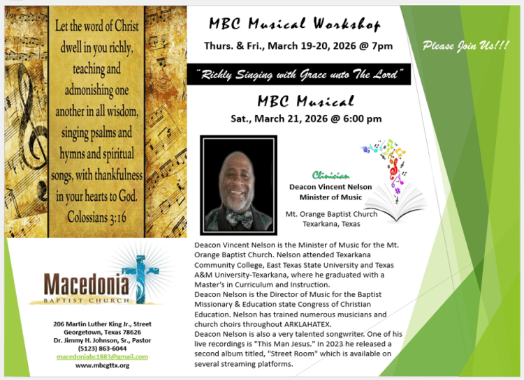 *Minister of Music: Deac. Vincent Nelson (Mt. Orange Baptist Church: Texarkana, Tx.)